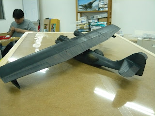 With the mask securely placed on all clear parts, the Blackcat was given its coat of flat black. The canvas covered portion was given various shades of sail, hull red, dark grey and light grey.